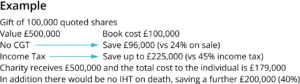 There may be a number of potential tax benefits available to individuals by gifting shares to charity. In addition to the capital gains tax benefit already mentioned, the value of the gifts shared can be deducted against gross income in the tax year of gift reducing the income tax bill, even down to £0.
